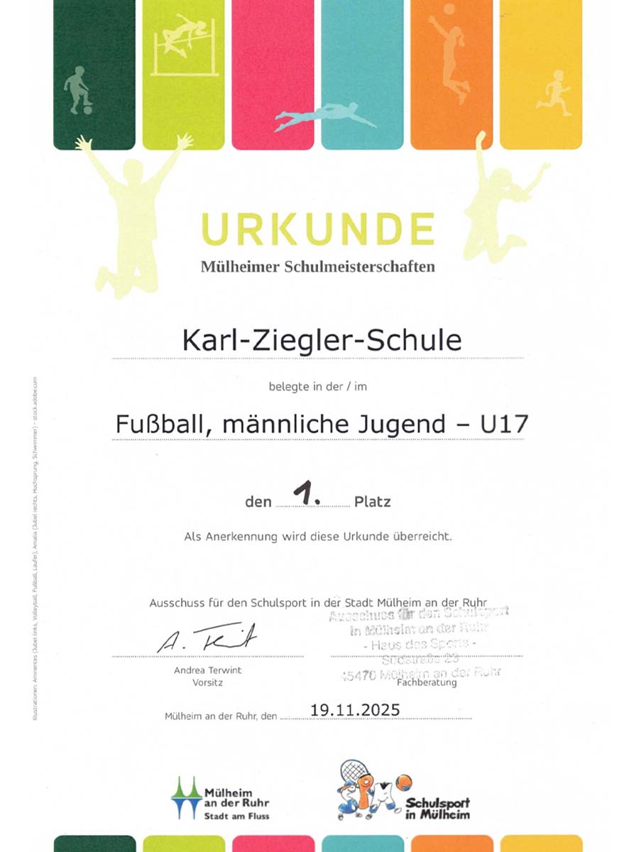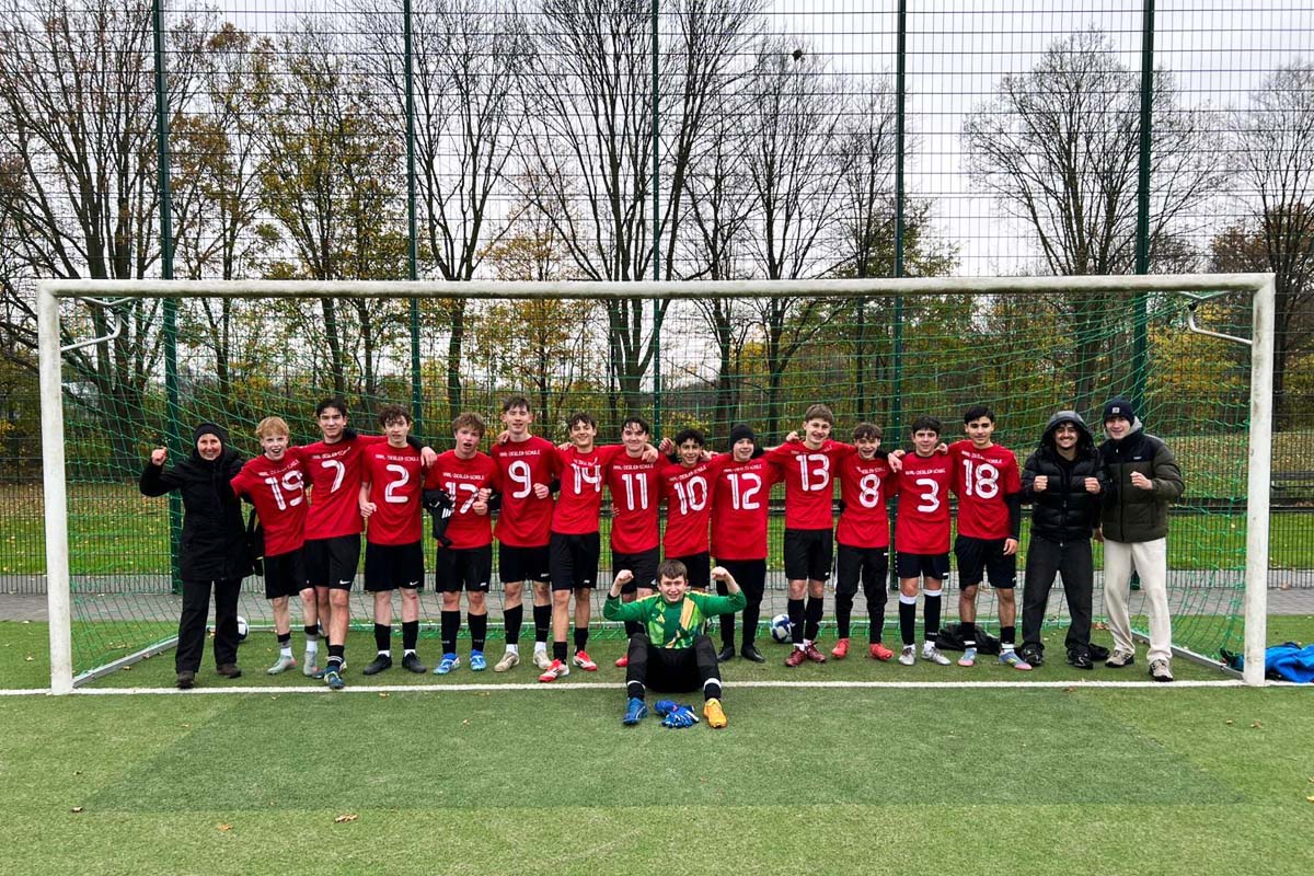 Unsere U17-Fußball-Jungen-Mannschaft hat heute erneut einen tollen Teamgeist gezeigt und mit der Unterstützung des Trainerteams jedes Spiel verdient gewonnen (auch wenn wir gegen die Gustav-Heinemann kurzzeitig im Rückstand lagen). Unsere Schule ist damit auch dieses Jahr erneut Stadtmeister der Mülheimer Schulen geworden.