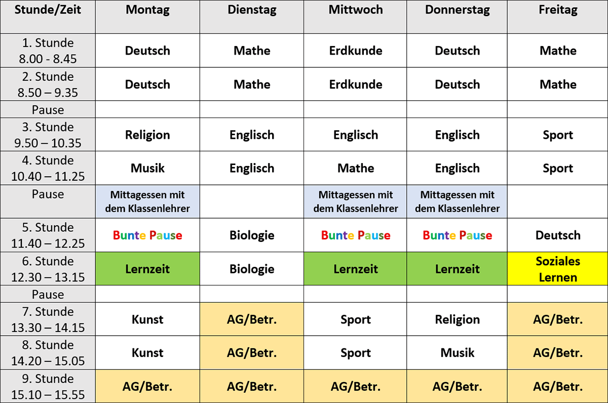 An drei Tagen in der Woche (Montag, Mittwoch und Donnerstag) dauert der Schultag von 08:00 bis 15:05 Uhr. Dienstags und freitags endet der Unterricht bereits um 13:15 Uhr. In die langen Tage sind feste Elemente wie Lernzeiten, die Bunte Pause und das gemeinsame Mittagessen eingebettet. So wechseln sich intensive Lernphasen, kreative oder sportliche Angebote und erholsame Pausen sinnvoll ab.